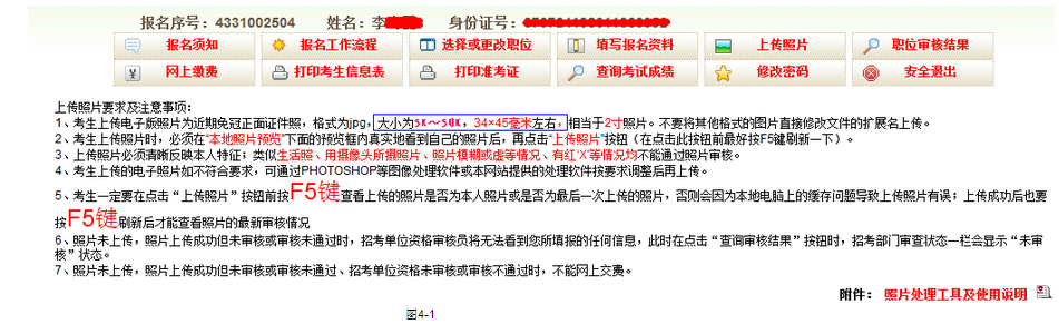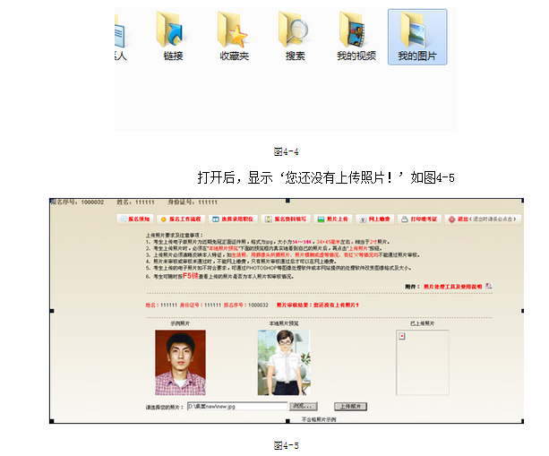 1、點(diǎn)擊‘照片上傳’進(jìn)入照片上傳界面,上傳照片前請(qǐng)?jiān)敿?xì)閱讀‘上傳照片要求及注意事項(xiàng)’如圖4-1。