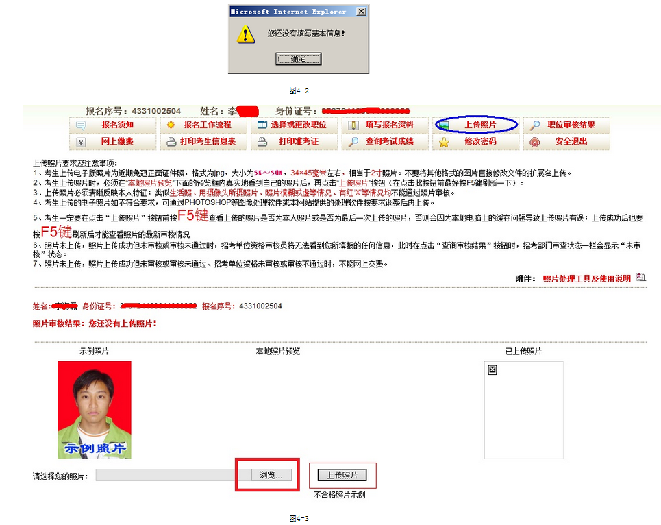 2、如果報(bào)名資料沒(méi)填寫(xiě),點(diǎn)擊‘照片上傳’按鈕就會(huì)有圖4-2提示。