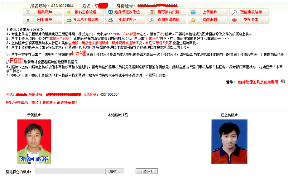 4、點(diǎn)擊‘上傳照片’按鈕,顯示‘已上傳照片,未審核,請(qǐng)等待審核!’如圖4-6,查看照片是否通過(guò),可在圖4-6的頁(yè)面進(jìn)行查看。需要注意:每次上傳或更換照片后必按F5鍵刷新,否則有可能在“本地照片預(yù)覽”框內(nèi)看到的是上一次的照片,導(dǎo)致上傳后的并非本人??忌牲c(diǎn)擊“不合格照片示例”按鈕查看不符合要求的照片(僅做示例)。