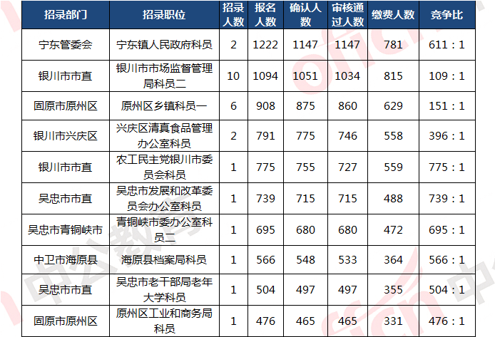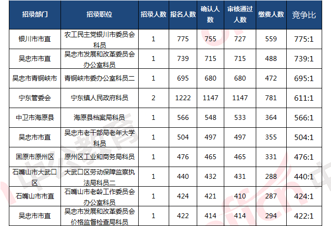 截止到3月31日10:00,報(bào)名競爭最激烈前三位職位依次是:農(nóng)工民主黨銀川市委員會(huì)科員、吳忠市發(fā)展和改革委員會(huì)辦公室科員、青銅峽市委辦公室科員二。三職位報(bào)名人數(shù)達(dá)2173人,占報(bào)名總?cè)藬?shù)的4%。為幫助廣大考生更清晰的了解今日?qǐng)?bào)名情況,中公網(wǎng)校整理了競爭最激烈的十大職位,供廣大考生參考,競爭比為775:1。