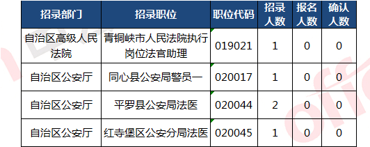 截止到31日10:00,無人報(bào)考職位:共有4個(gè)是:青銅峽市人民法院執(zhí)行崗位法官助理、同心縣公安局警員一、平羅縣公安局法醫(yī)、紅寺堡區(qū)公安分局法醫(yī)、。下面是無人報(bào)考職位一覽表,中公網(wǎng)校專家建議廣大考生多關(guān)注一些較冷職位,避免激烈競爭,結(jié)合自身?xiàng)l件,找到屬于自己的職位。
