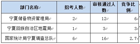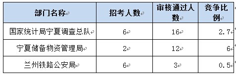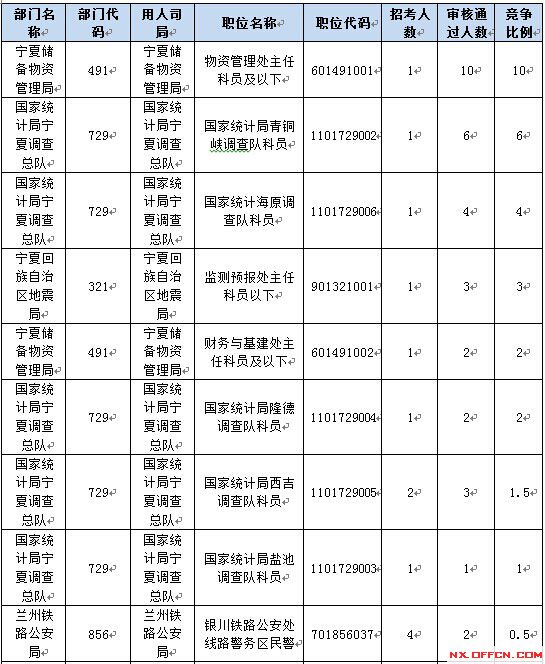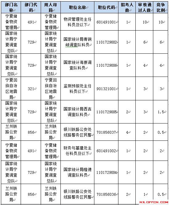 報(bào)名通過審核人數(shù)前十的職位主要集中在寧夏儲(chǔ)備物資管理局、國家統(tǒng)計(jì)局寧夏調(diào)查隊(duì)、蘭州鐵路公安局、寧夏回族自治區(qū)地震局等部門,具體信息如下: