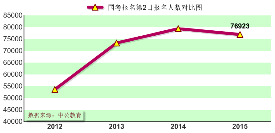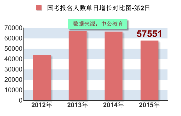 國(guó)考報(bào)名第2天,2015國(guó)考報(bào)名人數(shù)單日增長(zhǎng)57551人,趨近6萬(wàn)人。在四年中不算。