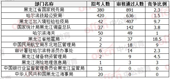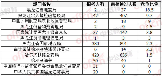 截至17日8時(shí),競爭比例前三位的部門依次是:黑龍江省地震局、黑龍江出入境檢驗(yàn)檢疫局、中國民用航空局東北地區(qū)管理局。