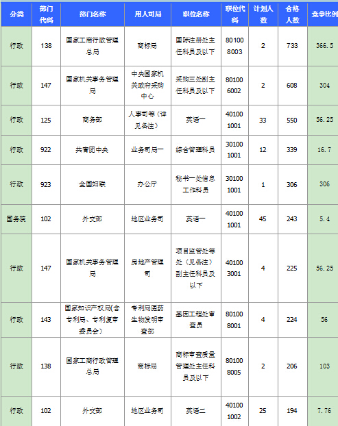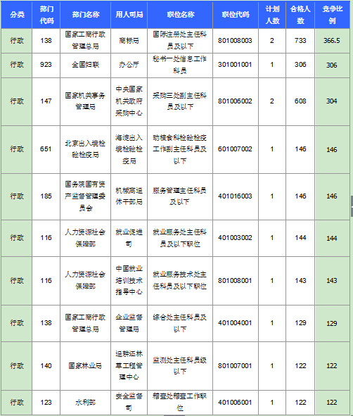 截至17日8時,招錄比例的職位為國家工商行政管理總局、商標局、國際注冊處主任科員及以下(職位代碼801008003),招錄2人,通過人數(shù)為773人,再創(chuàng)招錄比例新高!