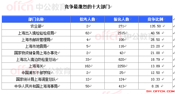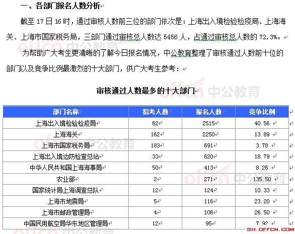10月17日16時,2015國家公務員考試報名進入第3天。據中公網校統(tǒng)計,國考職位中工作崗位在上海的職位通過審核的總人數為7474人,共有42個職位無人通過審核,平均競爭比例為11.64:1??忌枳⒁膺@并不是最終的報名人數,審核時間是截至2014年10月26日18:00。