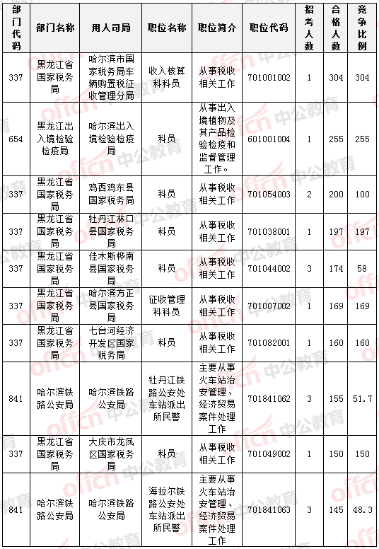 截至21日8時(shí),招錄比例的職位為黑龍江省國(guó)家稅務(wù)局哈爾濱市國(guó)家稅務(wù)局車輛購(gòu)置稅征收管理分局收入核算科科員一職,招錄1人,審核通過人數(shù)已經(jīng)達(dá)到304人,連續(xù)多日霸占首位,具體信息如下: