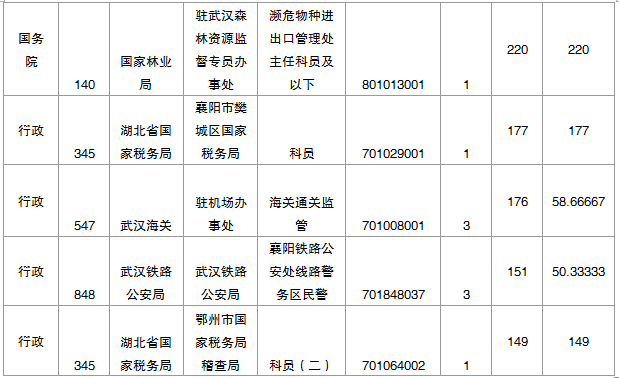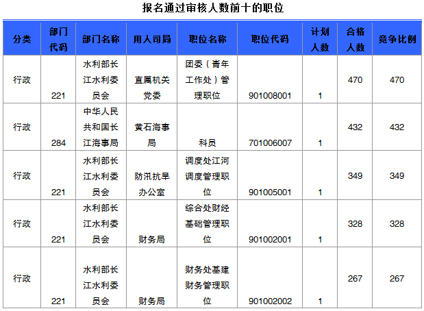 報名通過審核人數(shù)前十的職位主要集中在水利部長江水利委員會、中華人民共和國長江海事局黃石海事局等部門,具體信息如下: