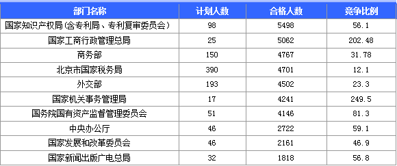 截至21日8時(shí),通過(guò)審核人數(shù)前三位的部門(mén)依次是:國(guó)家知識(shí)產(chǎn)權(quán)局(含專(zhuān)利局、專(zhuān)利復(fù)審委員會(huì))、國(guó)家工商行政管理總局、商務(wù)部,三部門(mén)通過(guò)審核總?cè)藬?shù)達(dá)15327人,占通過(guò)審核總?cè)藬?shù)的18.1%。
