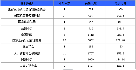 報(bào)名通過(guò)審核人數(shù)前十的職位主要集中在國(guó)家機(jī)關(guān)事務(wù)管理局、國(guó)家工商行政管理總局、商務(wù)部、共青團(tuán)中央等部門(mén),具體信息如下: