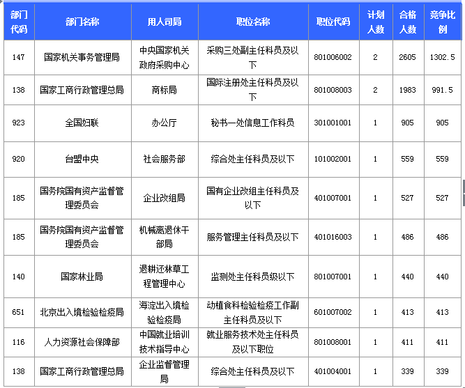 截至21日8時(shí),招錄比例的職位為國(guó)家機(jī)關(guān)事務(wù)管理局中央國(guó)家機(jī)關(guān)政府采購(gòu)中心采購(gòu)三處副主任科員及以下(職位代碼801006002),招錄2人,通過(guò)人數(shù)為2605人,再創(chuàng)招錄比例新高!
