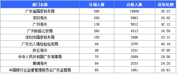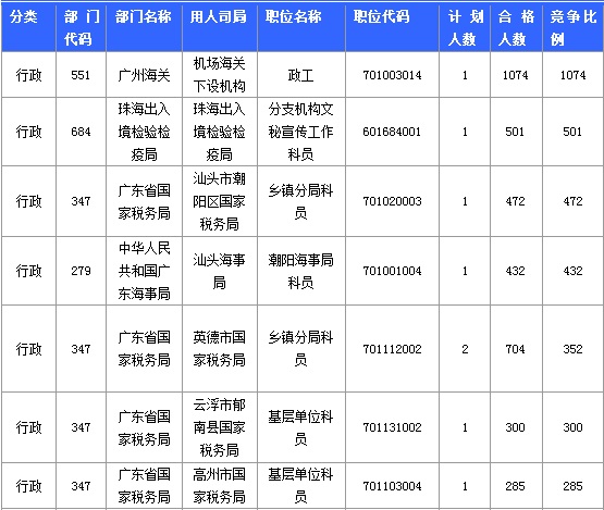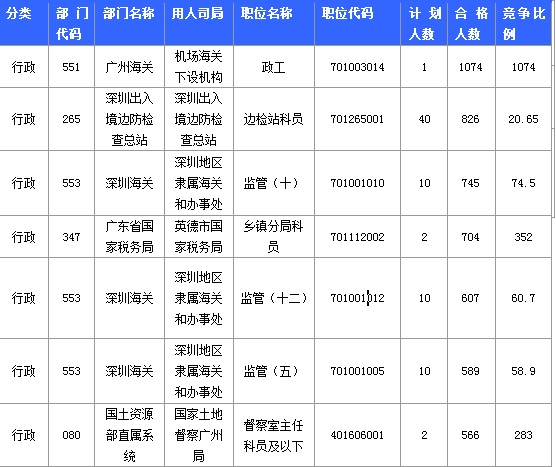 截至21日16時,招錄比例的職位為廣州海關政工一職,招錄1人,通過人數(shù)為1074人,報名通過審核人數(shù)前十的職位主要集中在廣州海關、深圳出入境邊防檢查總站、深圳海關等部門,具體信息如下: