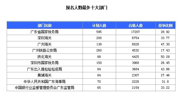 截至22日8時,通過審核人數(shù)前三位的部門依次是:廣東省國家稅務(wù)局、深圳海關(guān)、廣州海關(guān),三部門通過審核總?cè)藬?shù)達30489人,占通過審核總?cè)藬?shù)的47%。