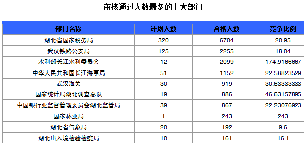 截至22日8時(shí),通過審核人數(shù)前三位的部門依次是:湖北省國家稅務(wù)局、武漢鐵路公安局、水利部長江水利委員會(huì),三部門通過審核總?cè)藬?shù)達(dá)11058人,占通過審核總?cè)藬?shù)的69.4%。