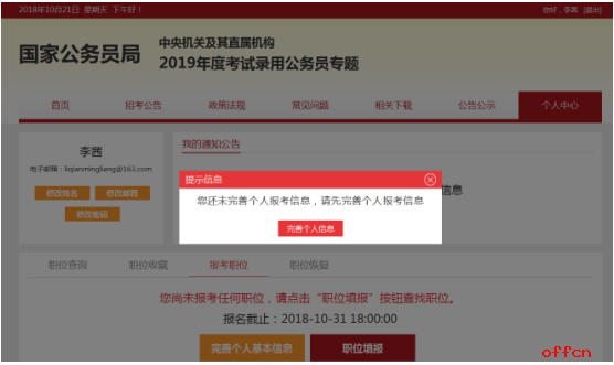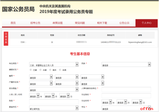 中公教育專家提醒考生,點(diǎn)擊“完善個(gè)人信息”之后就要進(jìn)入全面填寫信息頁(yè)面,考生們此時(shí)可將相關(guān)的證件準(zhǔn)備出來,以便填寫時(shí)準(zhǔn)確輸入,頁(yè)面詳情如下: