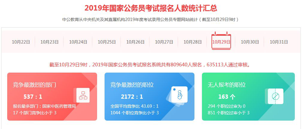 截至10月29日16時,2019年國家公務(wù)員考試報名系統(tǒng)共有876710人報名,713668人通過審核;