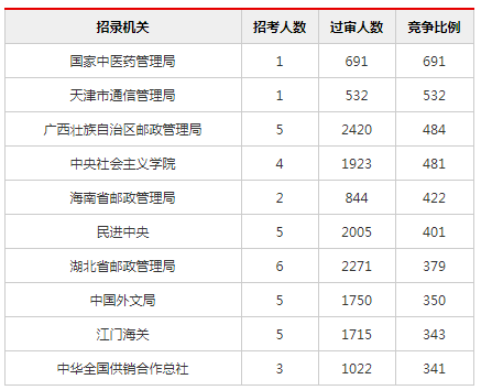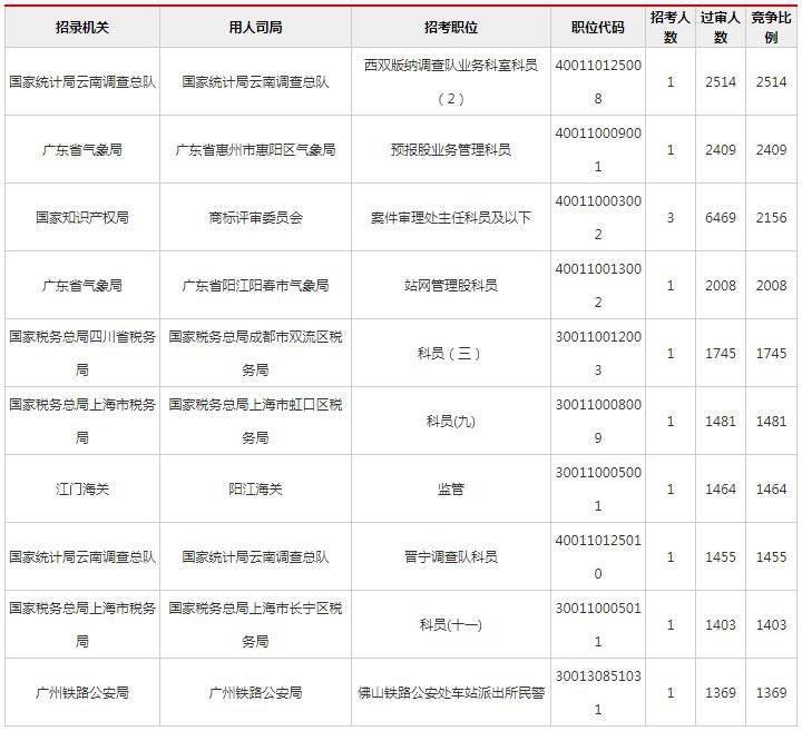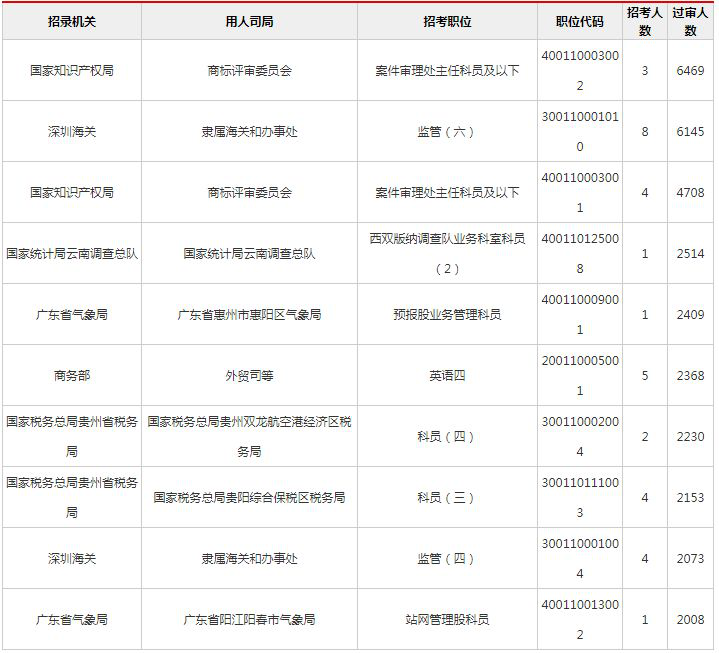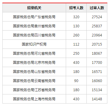 2019國考報名過審人數競爭最激烈前十職位