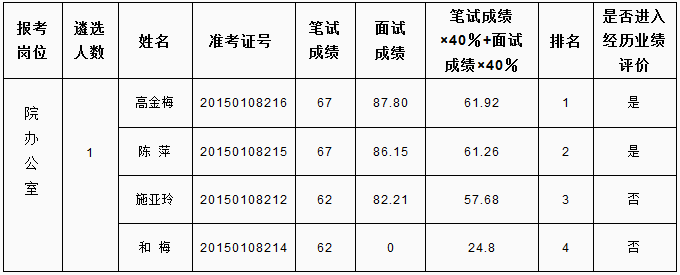 根據(jù)《怒江州2015年州級機關(guān)公開遴選公務(wù)員和參照公務(wù)員法管理單位工作人員公告》要求,面試由遴選單位負責實施,現(xiàn)將怒江州人民檢察院公開遴選公務(wù)員面試成績及進入業(yè)績評價人員名單公告如下: