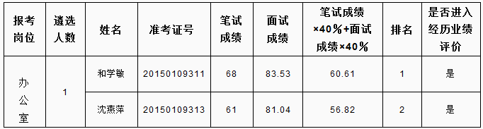 根據(jù)《怒江州2015年州級(jí)機(jī)關(guān)公開(kāi)遴選公務(wù)員和參照公務(wù)員法管理單位工作人員公告》要求,面試由遴選單位負(fù)責(zé)實(shí)施,現(xiàn)將中共怒江州委黨史研究室公開(kāi)遴選公務(wù)員面試成績(jī)及進(jìn)入業(yè)績(jī)?cè)u(píng)價(jià)人員名單公告如下: