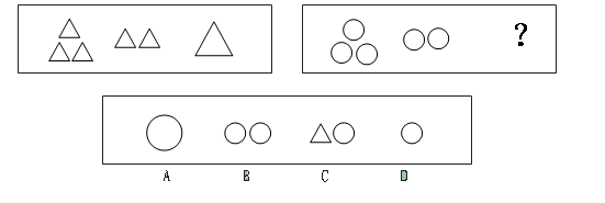 解析:答案為A。第一套圖形是三角形由三個遞減為一個,第二套圖形是圓形由三個減為兩個,最后一個是要填的圖形。很顯然,這兩套圖形排列的共同規(guī)律是圖形每下一個遞減一個。所以問號處應(yīng)填上一個圓。選項中A和D都是圓,那么究竟該選哪一個呢?再看第一套圖形,最后一個三角形明顯比前面的三角形大。所以問號處也應(yīng)是一個大圓。實際上這道題的排列用了兩種規(guī)律,若粗心大意,往往會認(rèn)為D是正確答案,而漏掉了真正的正確答案A。
