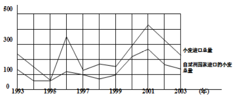1.從1993年到1997年中,該國共從亞洲國家進(jìn)口多少小麥(百萬噸)?