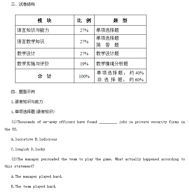 《英語學(xué)科知識(shí)與教學(xué)能力》(高級(jí)中學(xué))筆試大綱