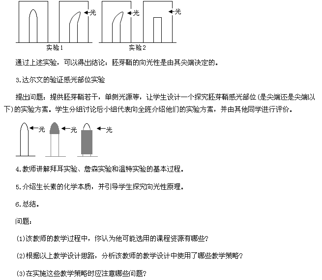 提前10天左右讓學(xué)生利用玉米種子培養(yǎng)幼苗(可用小培養(yǎng)皿,底部鋪浸濕濾紙的方 法)。實(shí)驗(yàn)分2組,一組在完全不透光的盒子中,另一組在一側(cè)開(kāi)孔的不透光盒子中。上課前選取實(shí)驗(yàn)結(jié)果較明顯的幼苗展示給學(xué)生,引導(dǎo)學(xué)生觀察實(shí)驗(yàn)現(xiàn)象,并提 出疑問(wèn):一側(cè)開(kāi)孔的盒子中的幼苗彎曲向光生長(zhǎng),為什么?