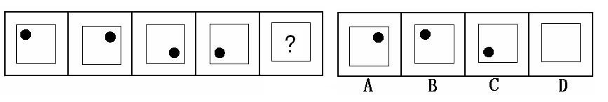 (答案:B。黑點(diǎn)在正方形中順時(shí)針移動(dòng)。在第5個(gè)圖形中,應(yīng)該正好移動(dòng)到左上角。)