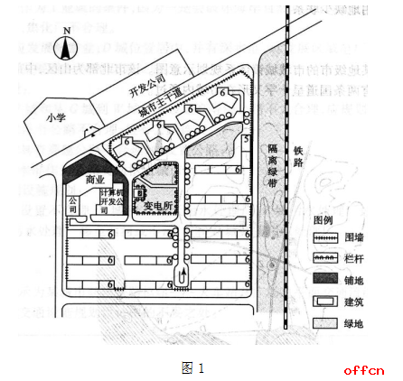 例題2:某居住組團已建成(如圖1所示),則該居住組團規(guī)劃在環(huán)境、交通及安全方面存在的主要問題包括( )。