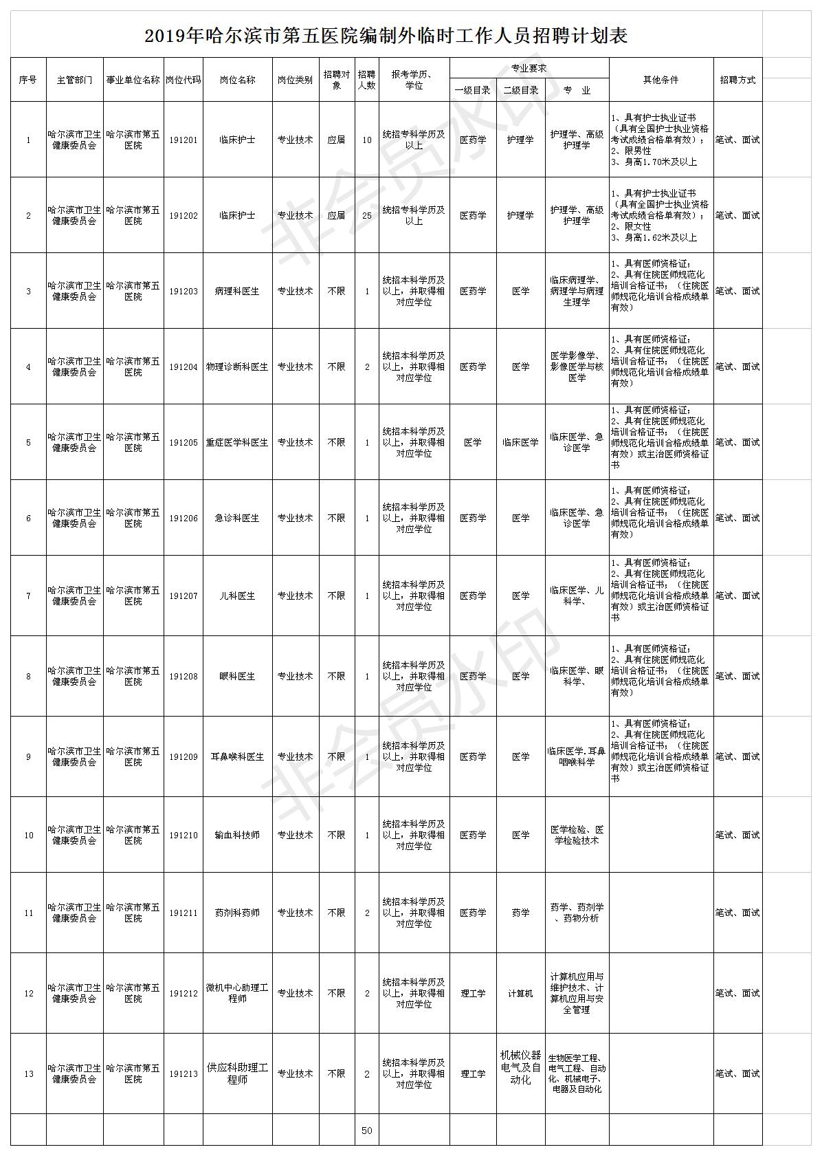 此次招聘編制外臨時(shí)工作人員50人。具體招聘崗位、人數(shù)、條件等詳見《哈爾濱市第五醫(yī)院2019年招聘編制外臨時(shí)工作人員計(jì)劃表》(以下簡(jiǎn)稱《招聘計(jì)劃表》)。
