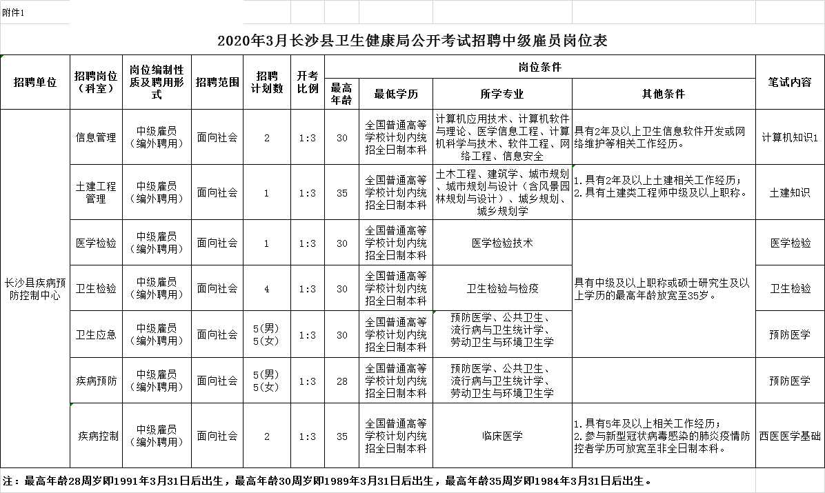 1、2020年3月長(zhǎng)沙縣衛(wèi)生健康局公開考試招聘中級(jí)雇員崗位表