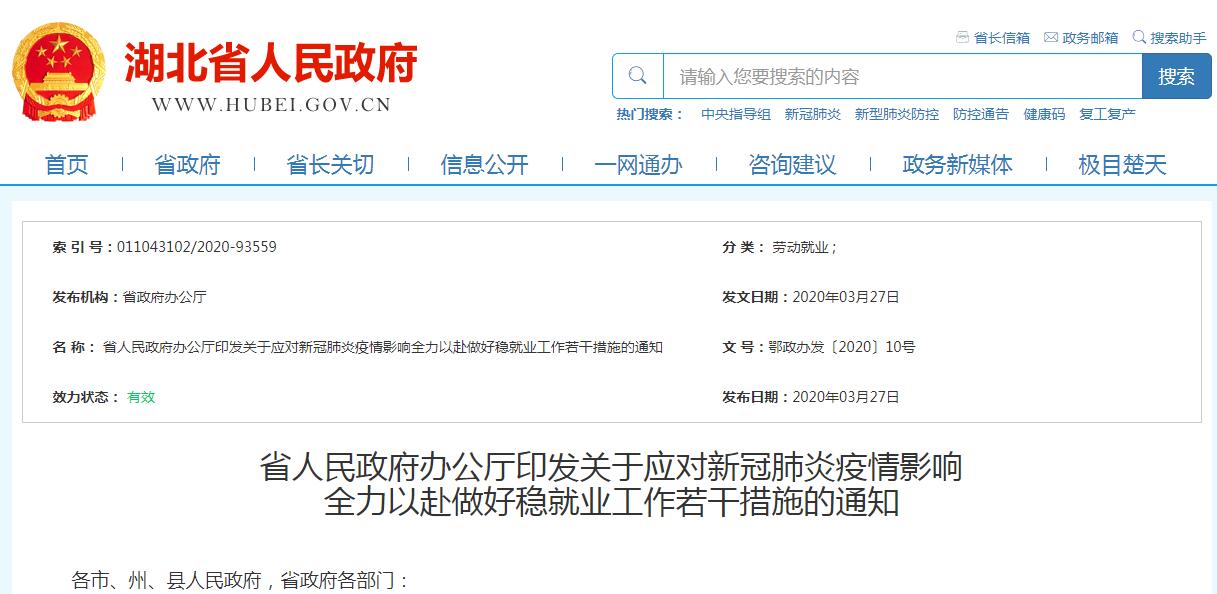 3月27日,湖北省政府辦公廳印發(fā)《關(guān)于應(yīng)對新冠肺炎疫情影響全力以赴做好穩(wěn)就業(yè)工作的若干措施》,圍繞全力推動安全有序復(fù)工返崗、支持企業(yè)減負(fù)穩(wěn)崗、促進(jìn)多渠道就業(yè)、促進(jìn)高校畢業(yè)生就業(yè)、推進(jìn)創(chuàng)業(yè)帶就業(yè)、實施就業(yè)扶貧、做好困難人員兜底、做實職業(yè)培訓(xùn)和就業(yè)服務(wù)、加強組織等9個方面,共計25條具體措施。