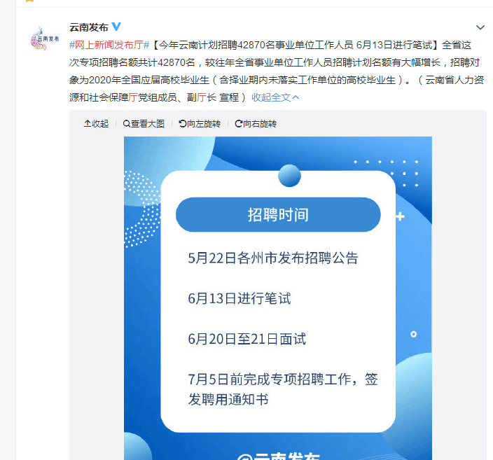 2020云南事業(yè)單位招聘考試有消息了,近日在中共云南省委宣傳部官方微博發(fā)布了一條關(guān)于2020云南事業(yè)單位招聘考試的消息,里面明確提到今年云南計(jì)劃招聘42870名事業(yè)單位工作人員 6月13日進(jìn)行筆試,全省這次專(zhuān)項(xiàng)招聘名額共計(jì)42870名,較往年全省事業(yè)單位工作人員招聘計(jì)劃名額有大幅增長(zhǎng),招聘對(duì)象為2020年全國(guó)應(yīng)屆高校畢業(yè)生(含擇業(yè)期內(nèi)未落實(shí)工作單位的高校畢業(yè)生)。以下是官方發(fā)布信息的截圖。