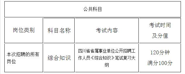 本次招聘考試所有崗位的筆試科目為公共科目?!端拇ㄊ∈偈聵I(yè)單位公開招聘工作人員《綜合知識》筆試復習大綱》見附件2,筆試均不指定復習資料,各崗位具體考試科目如下: