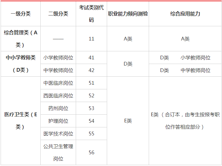 綜合管理類、中小學(xué)教師類、醫(yī)療衛(wèi)生類《職業(yè)能力傾向測驗(yàn)》和《綜合應(yīng)用能力》滿分均為150分,筆試總分300分。衛(wèi)生類綜合應(yīng)用能力為合訂本,由考生按報(bào)考職位作答相應(yīng)部分。