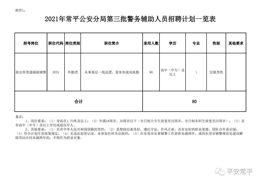 計(jì)劃招聘一批警務(wù)輔助人員(80人),具體崗位、招聘人數(shù)、資格條件等詳見《附件1:2021年常平公安分局第三批警務(wù)輔助人員招聘計(jì)劃一覽表》。