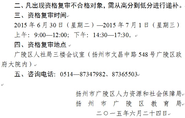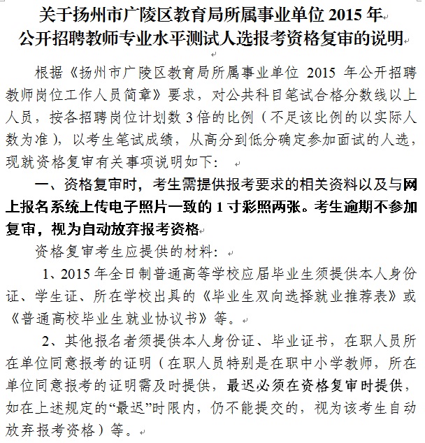2015江蘇揚州市廣陵區(qū)事業(yè)單位招聘面試人選報考資格復審說明