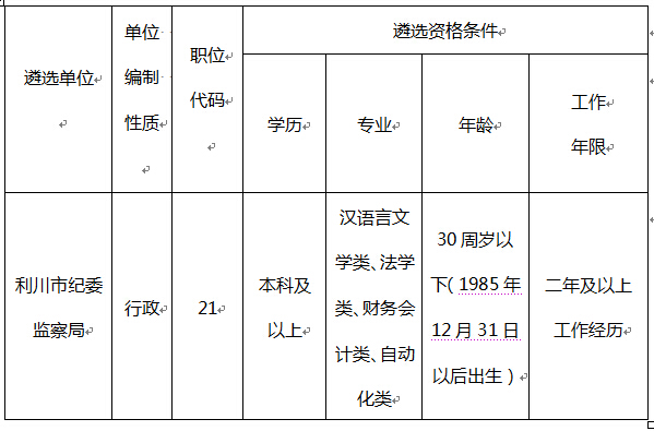經(jīng)用人單位申請(qǐng),市公開(kāi)遴選領(lǐng)導(dǎo)小組研究決定,增設(shè)利川市紀(jì)委監(jiān)察局公開(kāi)遴選工作人員職位,計(jì)劃遴選工作人員2名,該職位除報(bào)名時(shí)間延長(zhǎng)至2015年7月10日上午12:00外,其余報(bào)考基本要求及報(bào)名、考試、考察、公示等程序要求與《利川市2015年市直單位第一次公開(kāi)遴選公告(第1號(hào))》一致。職位具體條件如下: