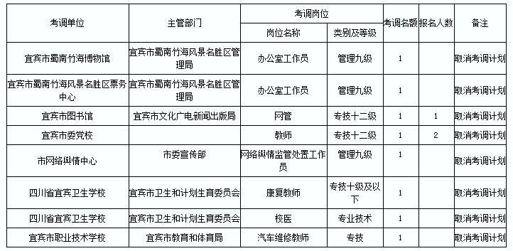 2015年上半年宜賓市市屬事業(yè)單位公開考調(diào)工作人員報(bào)名繳費(fèi)工作已結(jié)束,根據(jù)各崗位考生報(bào)名情況,部分未達(dá)考調(diào)公告規(guī)定的最低開考比例或無人報(bào)考的崗位,按考調(diào)公告規(guī)定予以調(diào)減或取消?,F(xiàn)將調(diào)減取消的崗位公告如下: