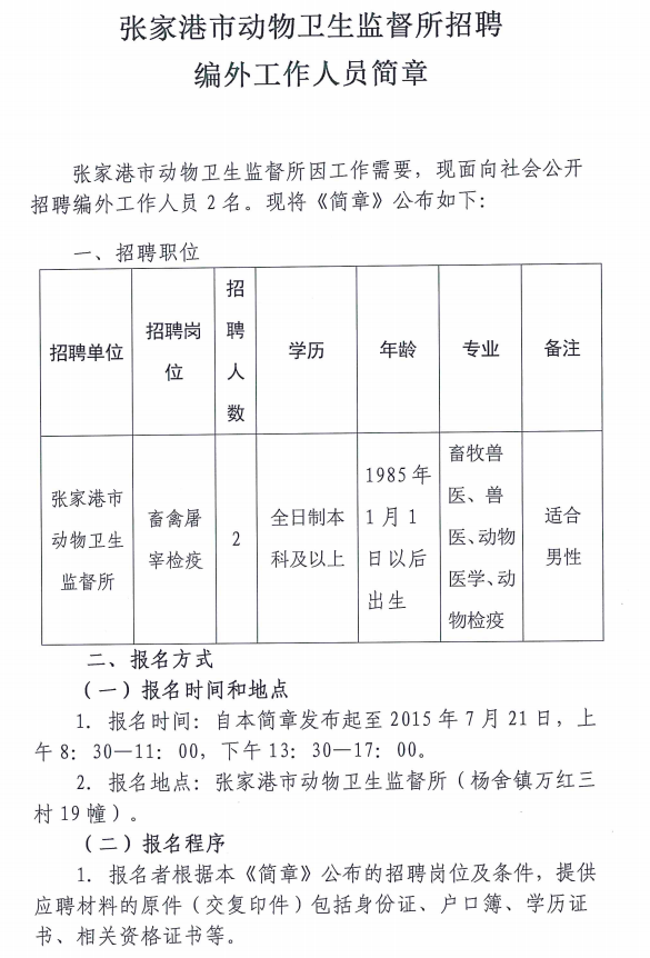 原標(biāo)題:2015張家港市動(dòng)物衛(wèi)生監(jiān)督所招聘編外工作人員簡(jiǎn)章