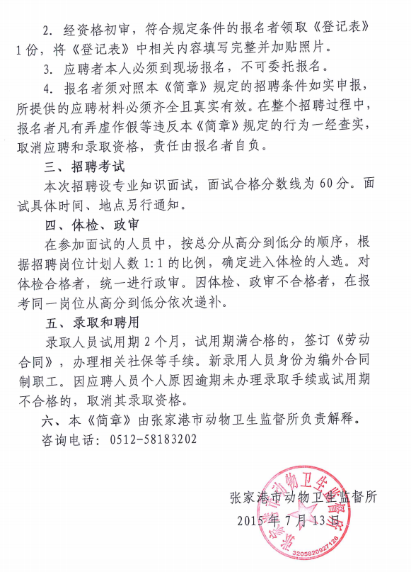 2015江蘇張家港市動(dòng)物衛(wèi)生監(jiān)督所招聘公告【招2人】