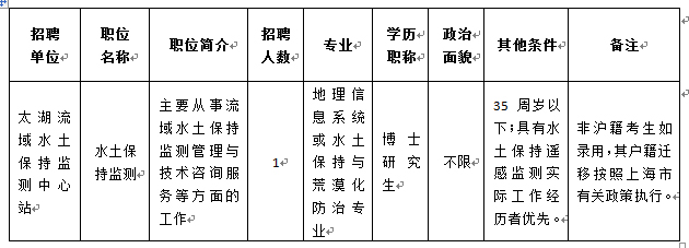 太湖流域水土保持監(jiān)測(cè)中心站公開招聘工作人員1名,招聘職位要求詳見下表。