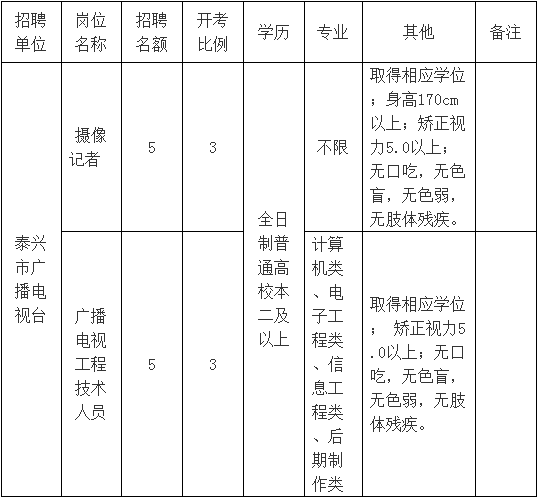本次擬招聘攝像記者5名、廣播電視工程技術(shù)人員5名。具體如下: