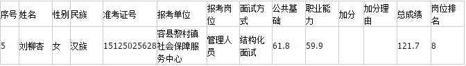 《2015年容縣事業(yè)單位公開招聘工作人員考試進入面試資格復審人員的公告》中容縣黎村鎮(zhèn)社會服務中心管理人員招聘人數2人,從到低分按1:3的比例,比例內末位2名考生筆試總成績并列第六名,同時確定為進入面試范圍人選,總共有7名考生進入該崗位面試資格復審。在面試資格復審時其中一名考生放棄了面試機會,比例內進入面試范圍人選為6名考生,按1:3比例不能進行遞補。因此,取消《2015年容縣事業(yè)單位公開招聘工作人員考試遞補進入面試資格復審人員的公告》中劉柳杏同志遞補進入面試資格復審人員資格,具體名單如下表: