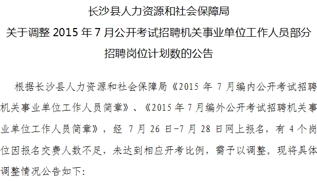 2015年7月湖南長沙考試機(jī)關(guān)事業(yè)單位調(diào)整招聘崗位計(jì)劃數(shù)公告