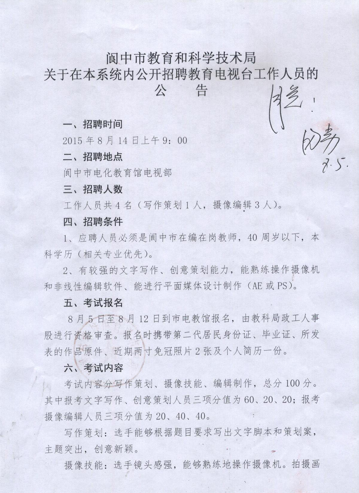 2015四川閬中市教育和科學(xué)技術(shù)局本系統(tǒng)內(nèi)招聘教育電視臺(tái)人員公告【招4人】