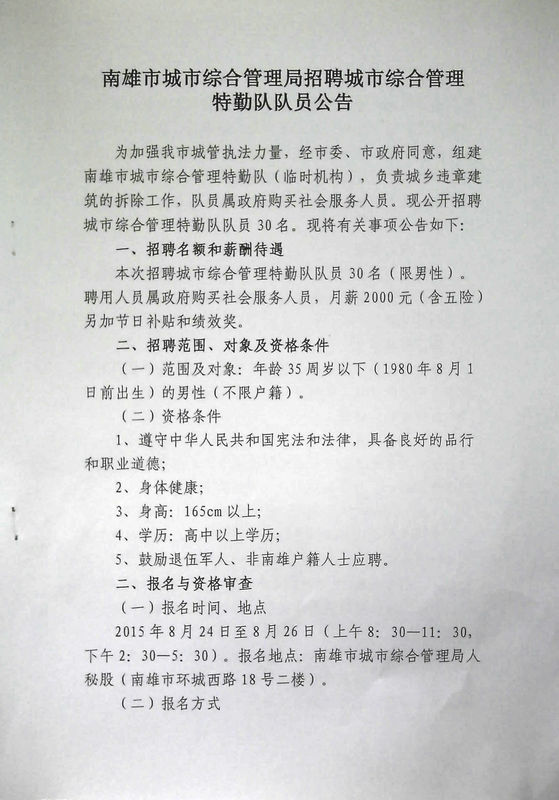 2015廣東南雄市城市綜合管理局招聘城市綜合管理特勤隊(duì)隊(duì)員30人公告