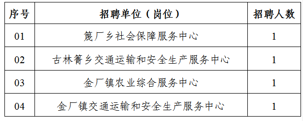 2015年我縣鄉(xiāng)鎮(zhèn)事業(yè)單位面向全省統(tǒng)一選聘、在我縣任滿兩個聘期的大學(xué)生村官招聘4名工作人員,具體崗位如下: