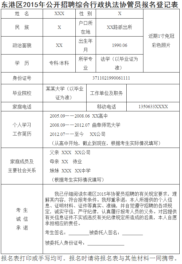 報(bào)名要求:報(bào)名時(shí)攜帶畢業(yè)證、報(bào)到證(未就業(yè)的),身份證及以上所有證件的復(fù)印件(A4紙)、戶(hù)口簿(或當(dāng)?shù)嘏沙鏊鶓?hù)籍證明)、近期1寸同底免冠彩照3張,已就業(yè)的需用人單位開(kāi)具單位同意報(bào)考證明加蓋公章,報(bào)名與考試時(shí)使用的身份證必須一致,委托他人報(bào)名者,被委托人應(yīng)持身份證等有效證件。請(qǐng)考生自行打印并填寫(xiě)招生簡(jiǎn)章最下方的《東港區(qū)2015年公開(kāi)招聘綜合行政執(zhí)法協(xié)管員報(bào)名登記表》,經(jīng)審查合格的人員,繳納考務(wù)費(fèi)40元。