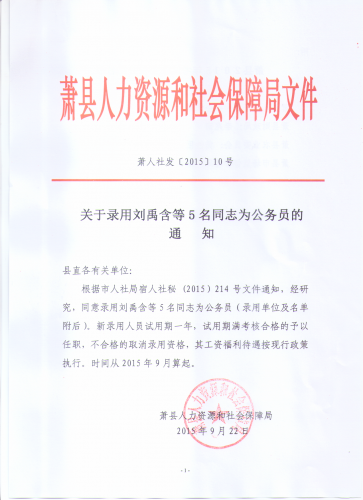 2015安徽蕭縣公務(wù)員考試錄用通知